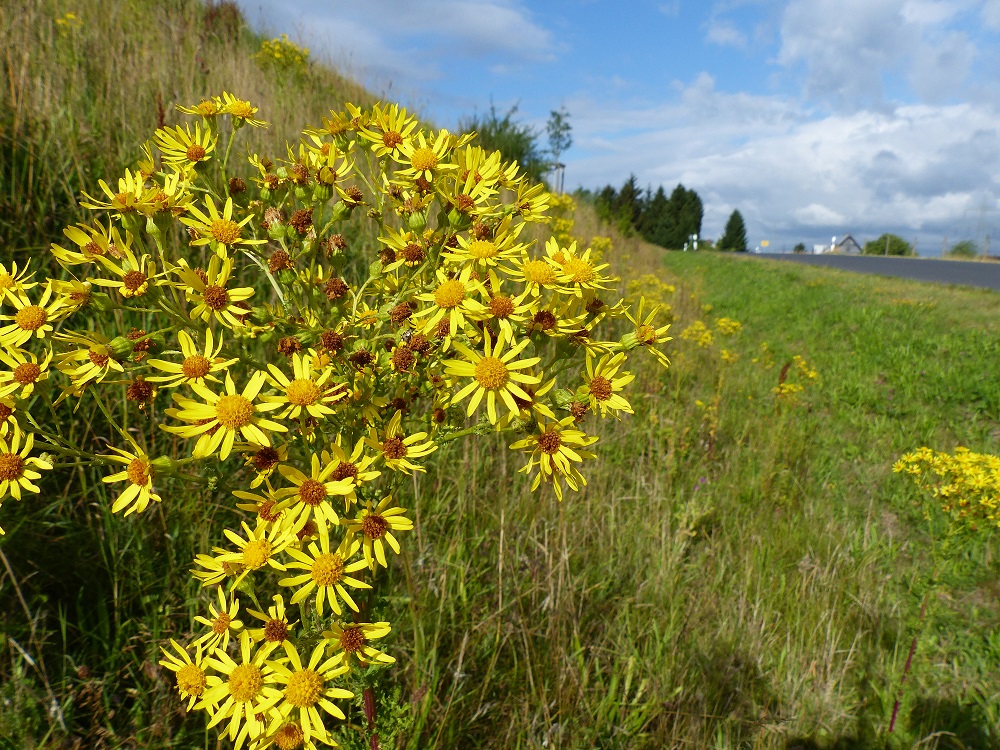 Jakobskreuzkraut ist eine heimische Giftpflanze. Sie nutzt die Lücken in der Grasnarbe, die durch die Trockenheit entstehen um sich stark auszubreiten. Oft sind die cadmiumgelben Blüten der einzige Farbtupfer in der Dürre. Sogar kleine Pflanzen blühen und produzieren Samen. Das Gefährliche an der Pflanze ist das Pyrrolizidin-Alkaloid. Das Gift sammelt sich über die Aufnahme kleiner Dosen in der Leber von Rindern, Schafen, Pferden und auch Menschen an, es wird nicht mehr abgebaut. Im frischen Zustand ist die Pflanze sehr bitter. Das fressen die Tiere nicht, wenn genug Futter da ist. Vor allem die getrocknete Pflanze ist für die Tiere im Heu oder Silo gefährlich. Für uns Menschen ist die Aufnahme über die Haut beim Ausreißen der Pflanze und die Aufnahme über Milch oder Honig gefährlich. Finden die Bienen keine anderen Blüten mehr, verarbeiten sie auch die giftigen Pollen des Jakobskreuzkrautes in den Honig, der dadurch belastet werden kann. Kühe, die viel Jakobskreuzkraut fressen, geben den Stoff auch über die Milch ab.
